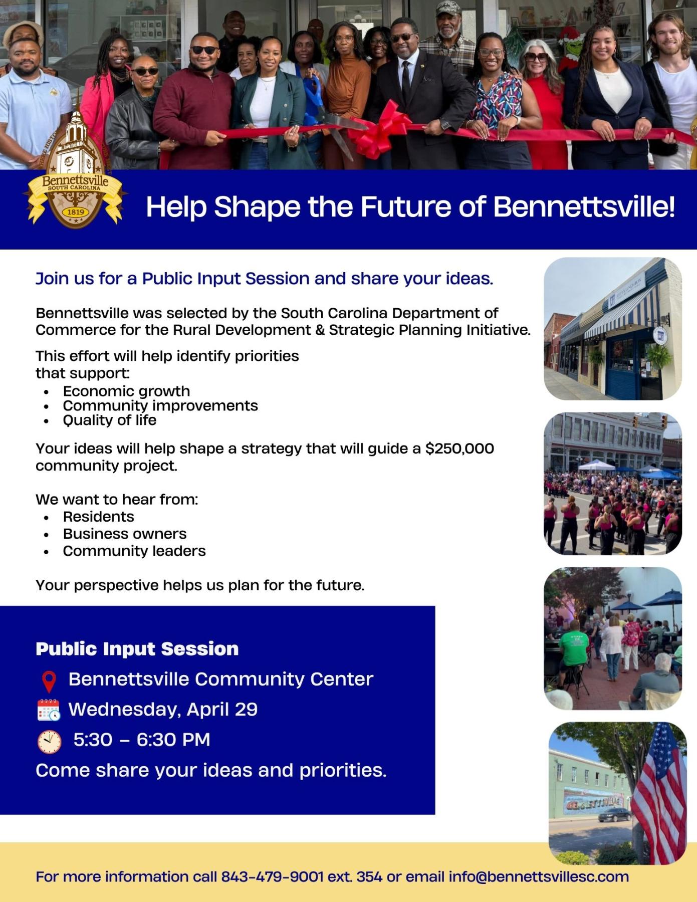 We invite you to attend the Public Input Session and share your ideas for Bennettsville’s future.